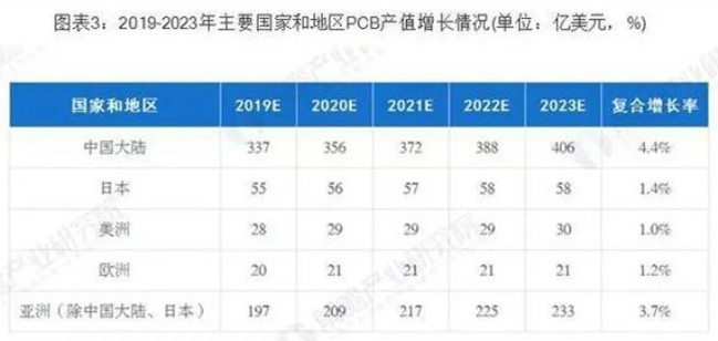 據(jù)Prismark預(yù)測(cè),未來5年亞洲將繼續(xù)主導(dǎo)全球PCB市場(chǎng)的發(fā)展,而中國(guó)的核心地位更加穩(wěn)固,中國(guó)大陸地區(qū)PCB行業(yè)將保持4.4%的復(fù)合增長(zhǎng)率,至2023年行業(yè)總產(chǎn)值將達(dá)到405.56億美元。在PCB公司"大型化、集中化"趨勢(shì)下,已較早確立領(lǐng)先優(yōu)勢(shì)的大型PCB公司將在未來全球市場(chǎng)競(jìng)爭(zhēng)中取得較大優(yōu)勢(shì)。